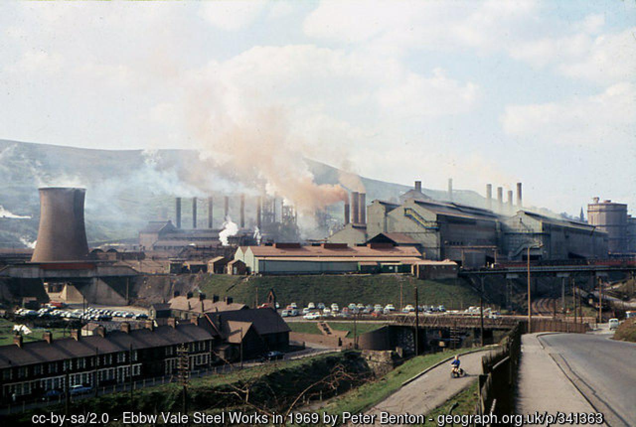 Golygfa o orffennol diwydiannol Cymru... Gwaith Dur Glynebwy yn y chwe degau.
