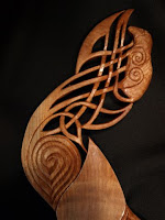 In the following couple of pictures, I hope to show some approaches to carving Celtic knotwork with keep the feel of wood rather than making the spoon look like it has been laced up. In this detail, a swirling Celtic spiral opens up and becomes a series of knot interlacings. Here, I have varied the width of the various knot strands to create some tension and to break up the monotony which would occur if they were all identical width.