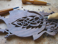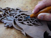 I'm working on cleaning up the Celtic knotwork this week. As with the front face, I plan to only go around the pattern cutting to a shallow depth until I am satisfied that all the 'overs and unders' are correctly placed. As with the vinework lower down, I have to make sure I am doing the exact opposite over under detail to the front face or it gets quiet seriously out of hand.