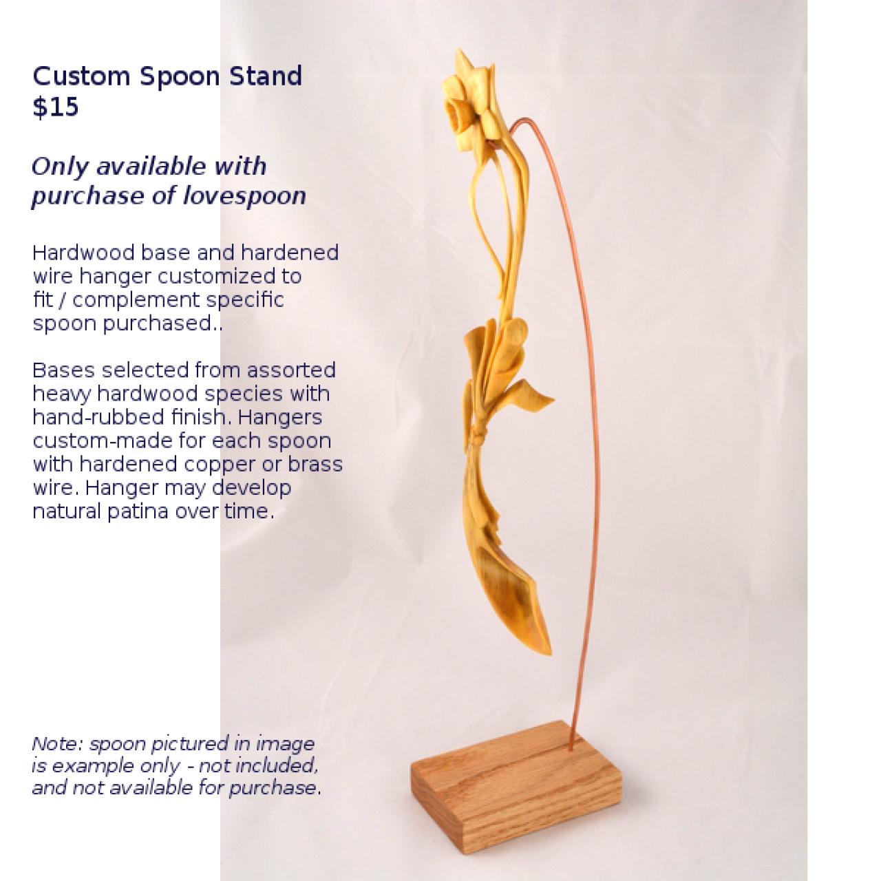 A custom Spoon Stand may be added to the purchase of any lovespoon, for an additional $15. Stands are a heavy hardwood base (color/species selected to complement each spoon) with a hardened wire (copper or brass) hanger, also customized to fit the purchased spoon. Wires may develop a natural patina over time. (note - example spoon in image of stand is not included, and not available for purchase)